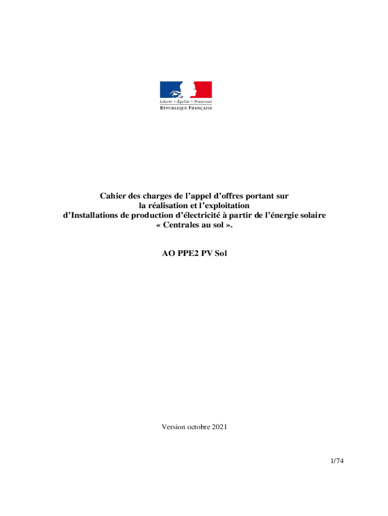 Cahier des charges de lappel doffres portant sur la ralisation et lexploitation dInstallations de production dlectricit partir de lnergie solaire Centrales au sol . AO PPE2 PV SolVersion octobre 20211/74Sommaire