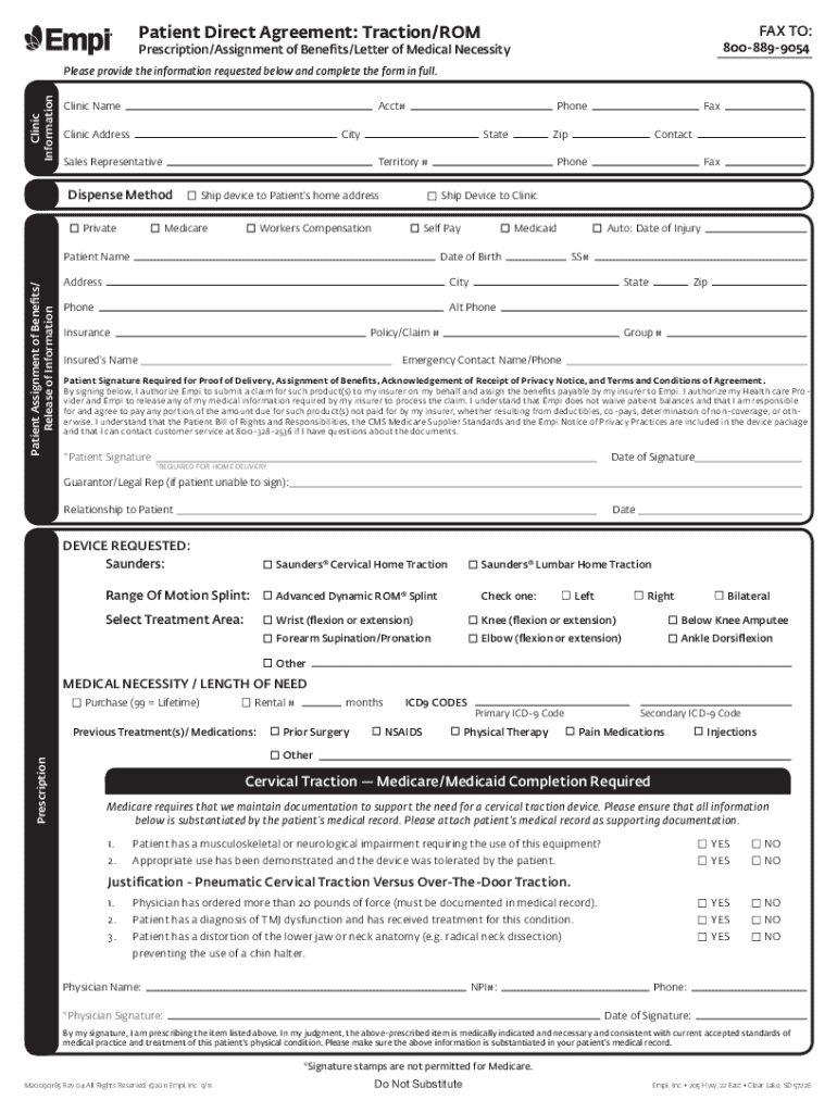 Patient Direct Agreement: Traction/ROMFAX TO:Prescription/Assignment of Benefits/Letter of Medical Necessity8008899054Clinic InformationPlease provide the information requested below and complete