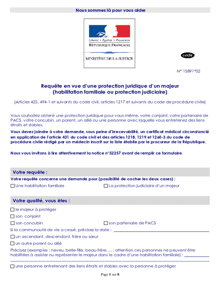 Nous sommes l pour vous aiderN 15891*02Requte en vue dune protection juridique dun majeur (habilitation familiale ou protection judiciaire) (Articles 425, 4941 et suivants du code civil, articles