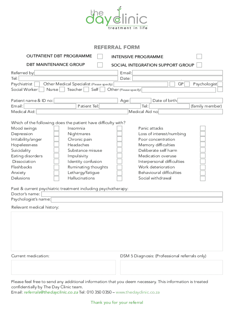 REFERRAL FORM OUTPATIENT DBT PROGRAMMEINTENSIVE PROGRAMMEDBT MAINTENANCE GROUPSOCIAL INTEGRATION SUPPORT GROUPReferred by:Tel:Psychiatrist Social WorkerEmail: Date:Other Medical Specialist (Please