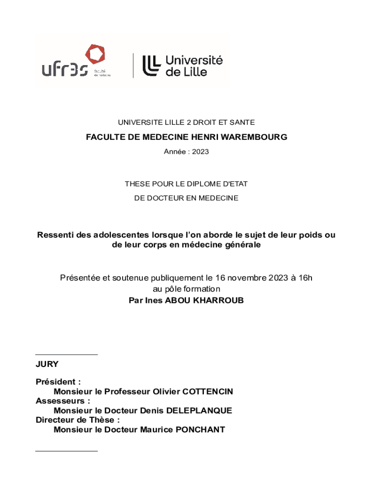 Anne : 2023THESE POUR LE DIPLOMA D\'ETA TDE DOCTOR EN MEDECINERessenti DES adolescents mosque Lon abode LE suet de Lear ponds