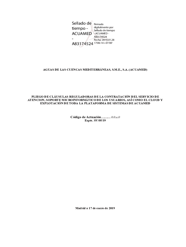 Sellado de Firmado por tiempo digitalmente Sellado de tiempo ACUAMED ACUAMED A83174524 Fecha: 2019.01.28 A83174524 17:06:14 +01\'00\'AGUAS DE LAS CUENCAS MEDITERRNEAS, S.M.E., S.A. (ACUAMED)PLIEGO