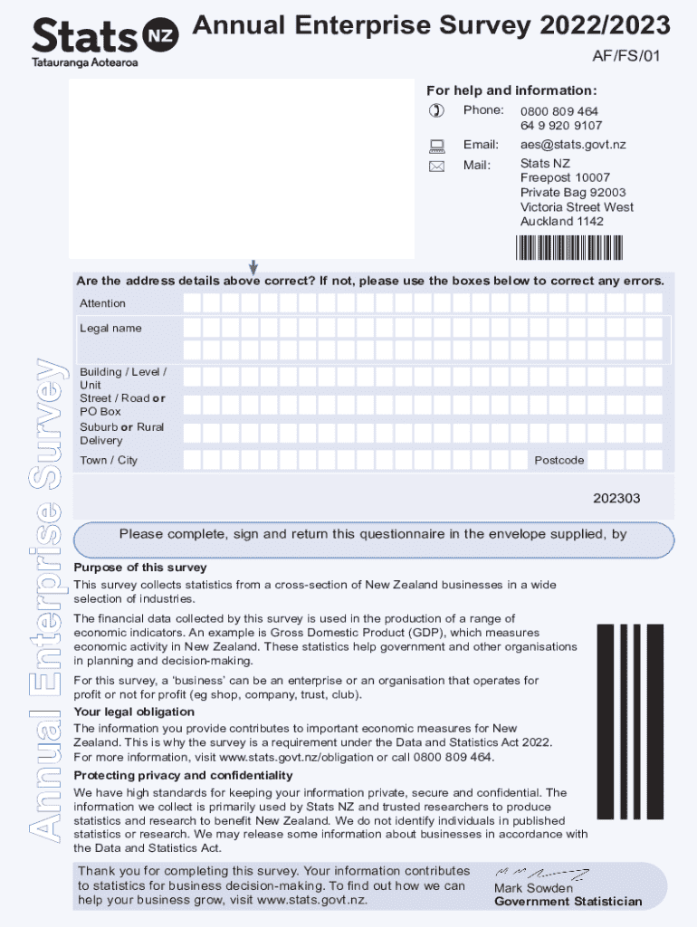 Annual Enterprise Survey 2022/2023 AF/FS/01 For help and information:Phone:0800 809 464 64 9 920 9107Email:aes@stats.govt.nzMail:Stats NZ Freepost 10007 Private Bag 92003 Victoria Street West Auckland