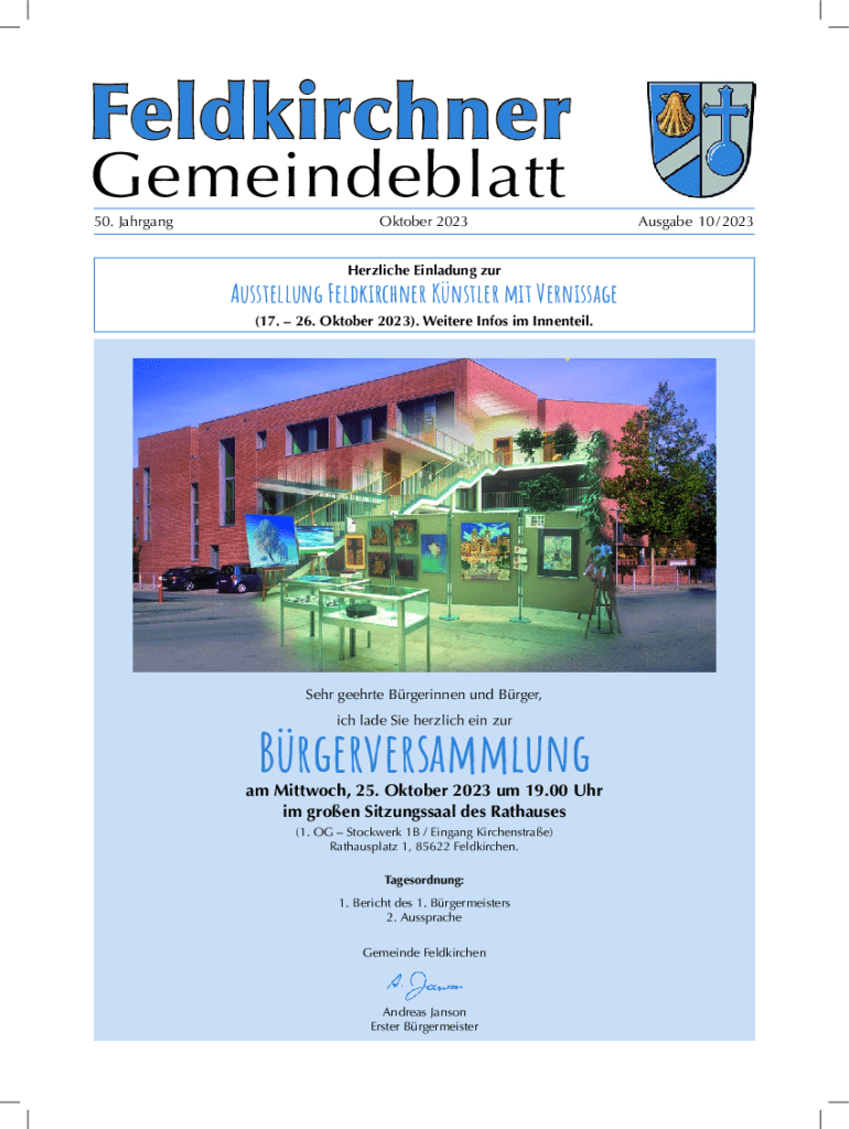 Feldkirchner Gemeindeblatt10/2023Feldkirchner Gemeindeblatt 50. JahrgangOktober 2023Herzliche Einladung zurAusstellung Feldkirchner Knstler mit Vernissage (17. 26. Oktober 2023). Weitere Infos im