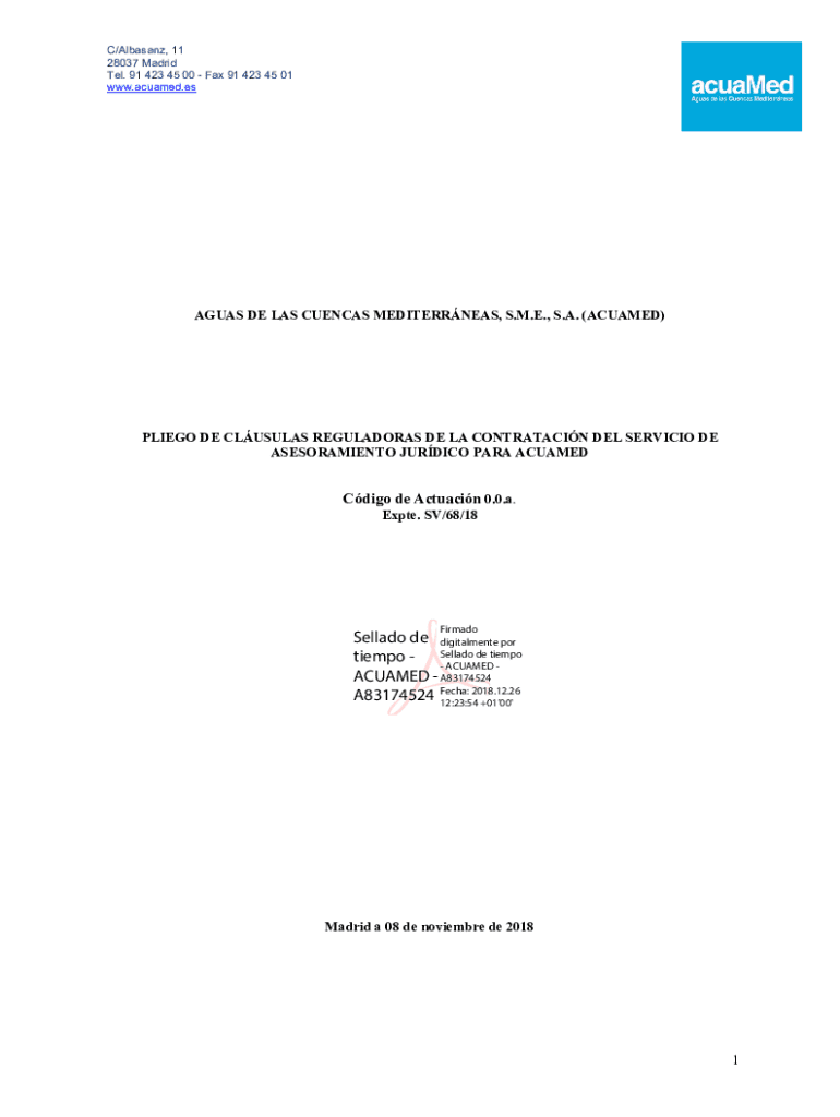 C/Albasanz, 11 28037 Madrid Tel. 91 423 45 00 Fax 91 423 45 01 www.acuamed.esAGUAS DE LAS CUENCAS MEDITERRNEAS, S.M.E., S.A. (ACUAMED)PLIEGO DE CLUSULAS REGULADORAS DE LA CONTRATACIN DEL SERVICIO