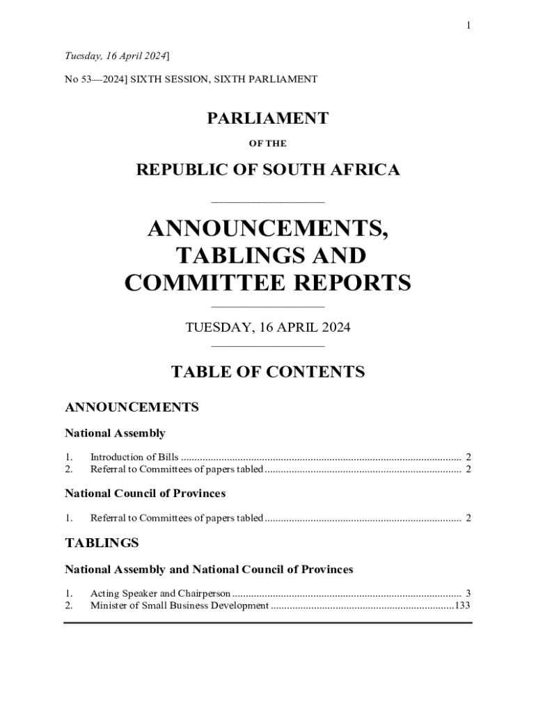 1 Tuesday, 16 April 2024] No 532024] SIXTH SESSION, SIXTH PARLIAMENTPARLIAMENT OF THEREPUBLIC OF SOUTH AFRICA ___ANNOUNCEMENTS, TABLINGS AND COMMITTEE REPORTS ___TUESDAY, 16 APRIL 2024 ___TABLE OF