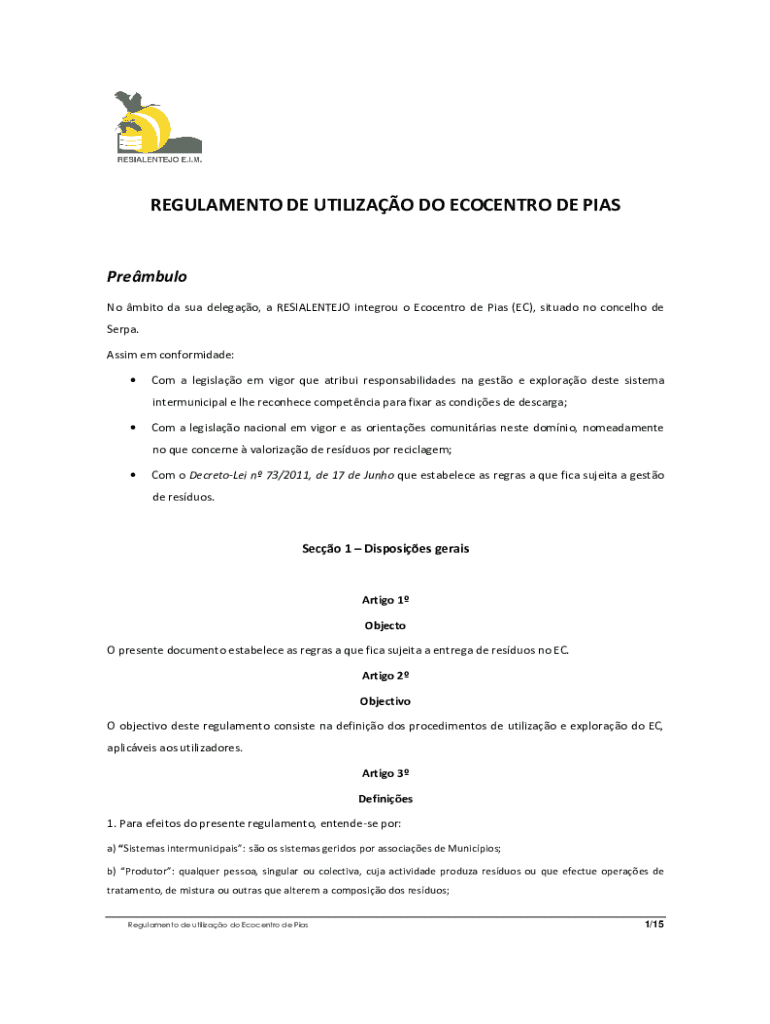 REGULAMENTO DE UTILIZAO DO ECOCENTRO DE PIASPrembulo No mbito da sua delegao, a RESIALENTEJO integrou o Ecocentro de Pias (EC), situado no concelho de Serpa. Assim em conformidade: Com a legislao