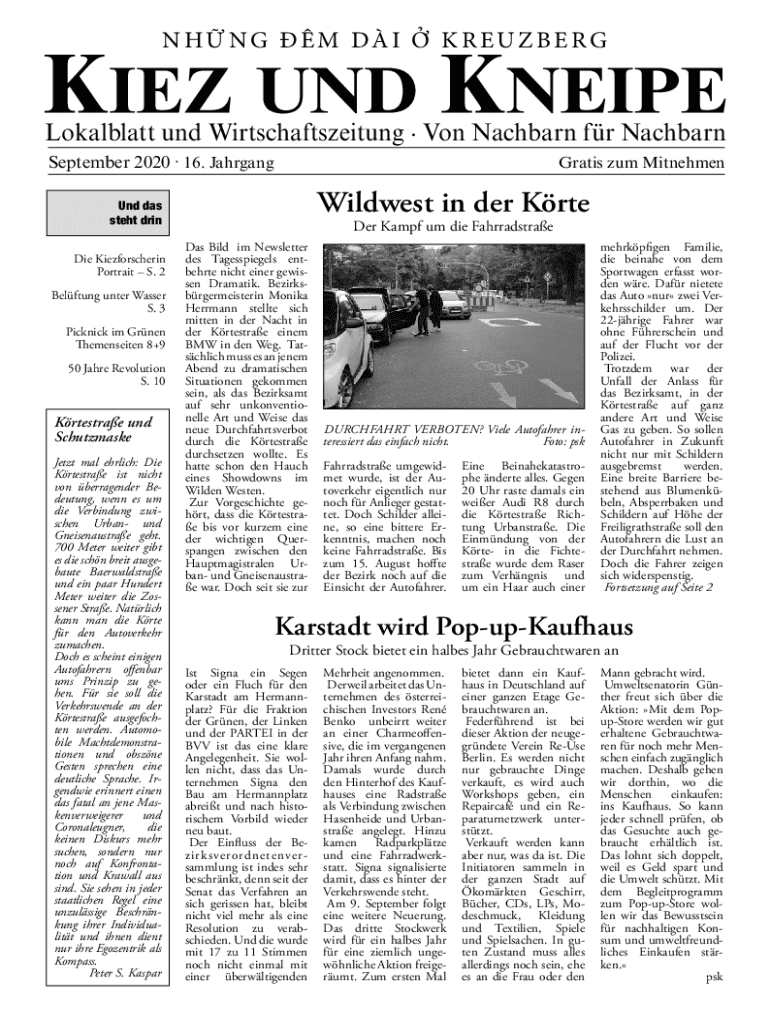 N H N G M D I K R E U Z B E R GLokalblatt und Wirtschaftszeitung . Von Nachbarn fr Nachbarn September 2020 . 16. JahrgangGratis zum MitnehmenWildwest in der KrteUnd das steht drin Die Kiezforscherin