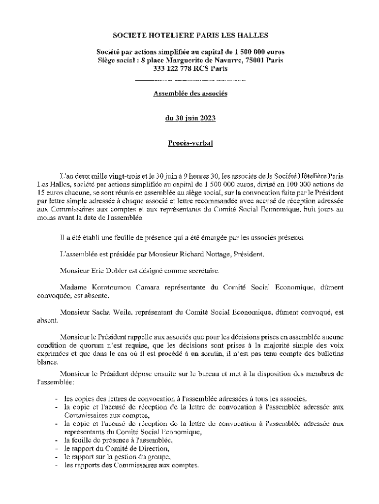 SOCIETE HOTELIERE PARIS LES HALLES Socitpar actions simplifie an capital de 1 500 000 euros Siege social: 8 place Marguerite de Navarre, 75001 Paris 333 122 778 RCS ParisAssemble des associsdu 30mm2023ProcsverbalLan