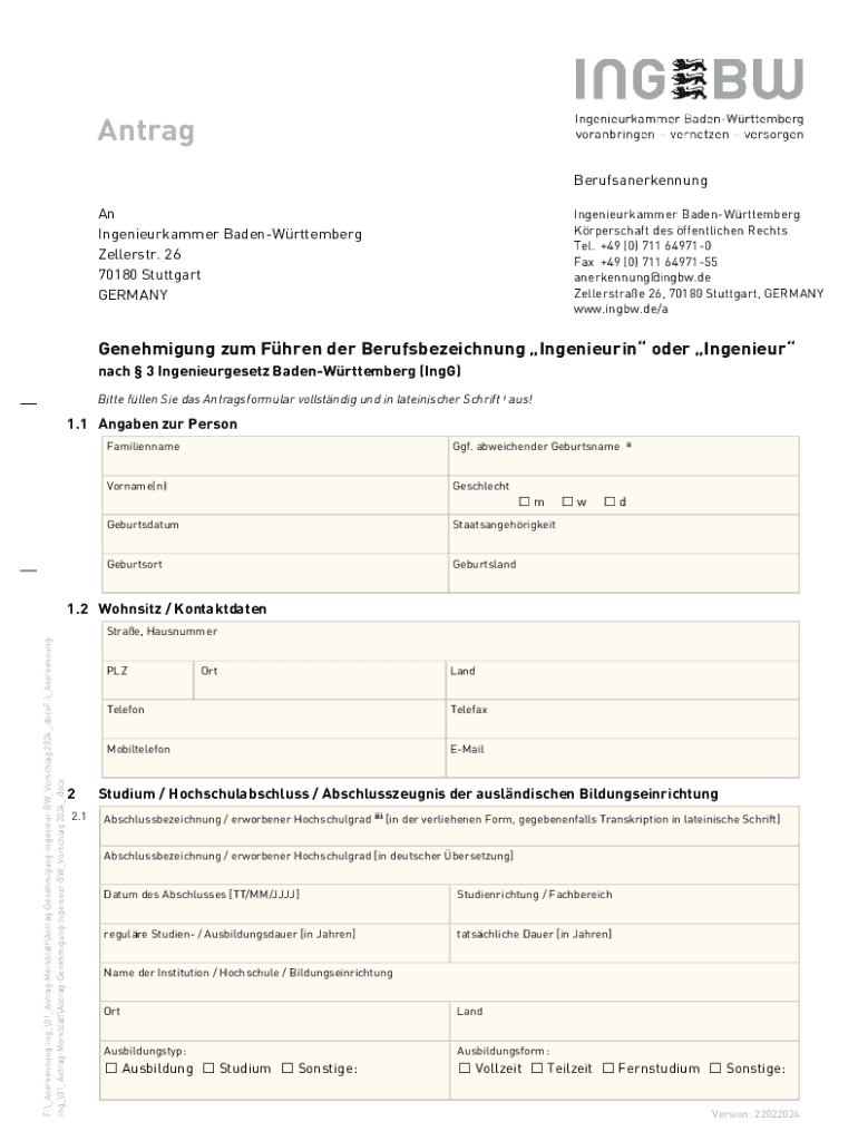 Antrag Berufsanerkennung An Ingenieurkammer BadenWrttemberg Zellerstr. 26 70180 Stuttgart GERMANYIngenieurkammer BadenWrttemberg Krperschaft des ffentlichen Rechts Tel. +49 (0) 711 649710 Fax +49