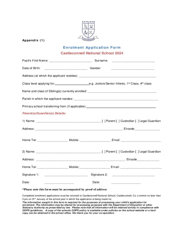 Append ix ( 1)Enrolment Application Form Castleconnell National School 2024 Pupils First Name: ___ Surname:___Date of Birth:______ Gender:Address (at which the applicant resides): ___ Class level
