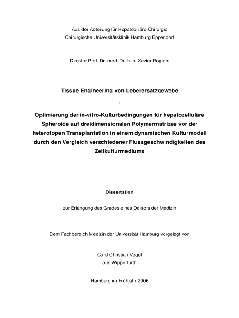 Aus der Abteilung fr Hepatobilire Chirurgie Chirurgische Universittsklinik Hamburg EppendorfDirektor Prof. Dr. med. Dr. h. c. Xavier RogiersTissue Engineering von Leberersatzgewebe Optimierung der