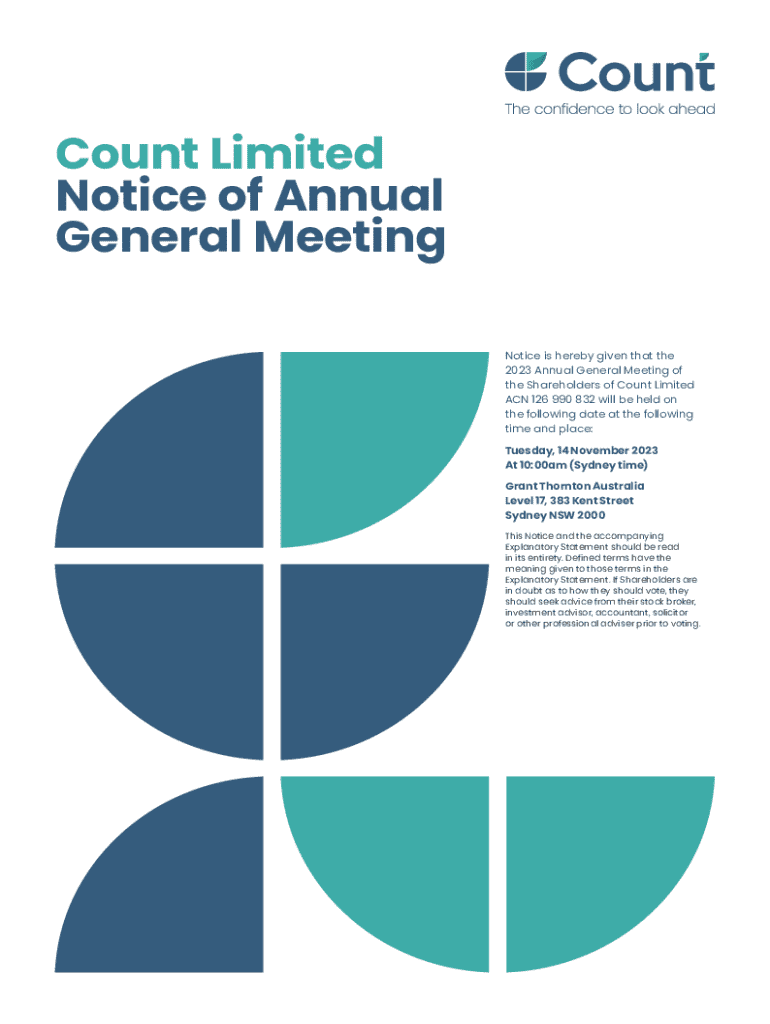 Count Limited Notice of Annual General Meeting Notice is hereby given that the 2023 Annual General Meeting of the Shareholders of Count Limited ACN 126 990 832 will be held on the following date at