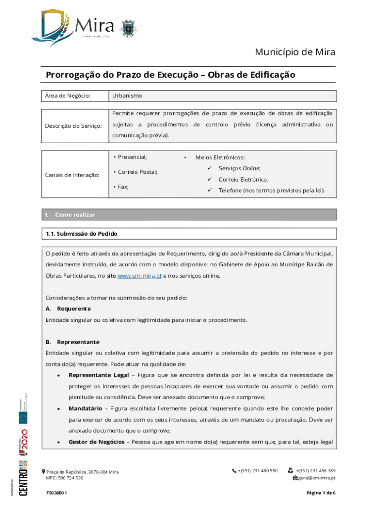 Municpio de Mira Prorrogao do Prazo de Execuo Obras de Edificao rea de Negcio:Urbanismo Permite requerer prorrogaes de prazo de execuo de obras de edificaoDescrio do Servio:sujeitas a procedimentos
