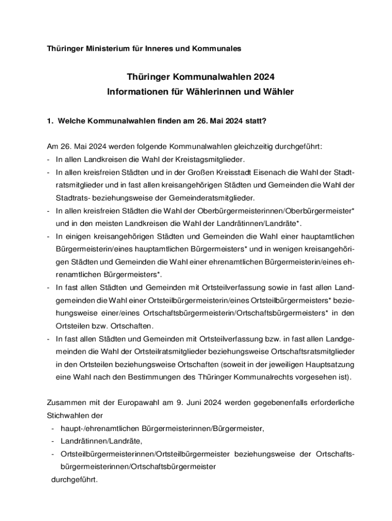 Thringer Ministerium fr Inneres und KommunalesThringer Kommunalwahlen 2024 Informationen fr Whlerinnen und Whler 1. Welche Kommunalwahlen finden am 26. Mai 2024 statt?Am 26. Mai 2024 werden folgende