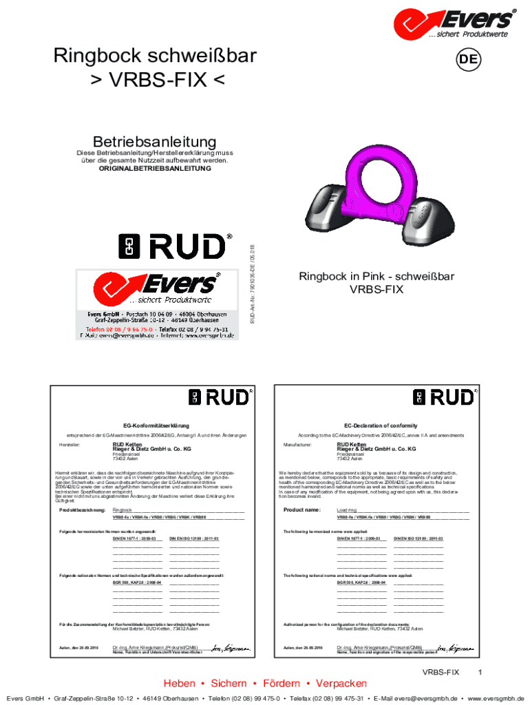 Ringbock schweibar VRBSFIX DEBetriebsanleitungRUDArt.Nr.: 7901035DE / 05.018Diese Betriebsanleitung/Herstellererklrung muss ber die gesamte Nutzzeit aufbewahrt werden. ORIGINALBETRIEBSANLEITUNGRingbock