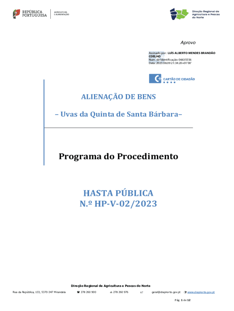 Aprovo Assinado por: LUS ALBERTO MENDES BRANDO COELHO Num. de Identificao: 06635556 Data: 2023.08.09 21:34:20+01\'00\'ALIENAO DE BENS Uvas da Quinta de Santa BrbaraPrograma do ProcedimentoHASTA PBLICA