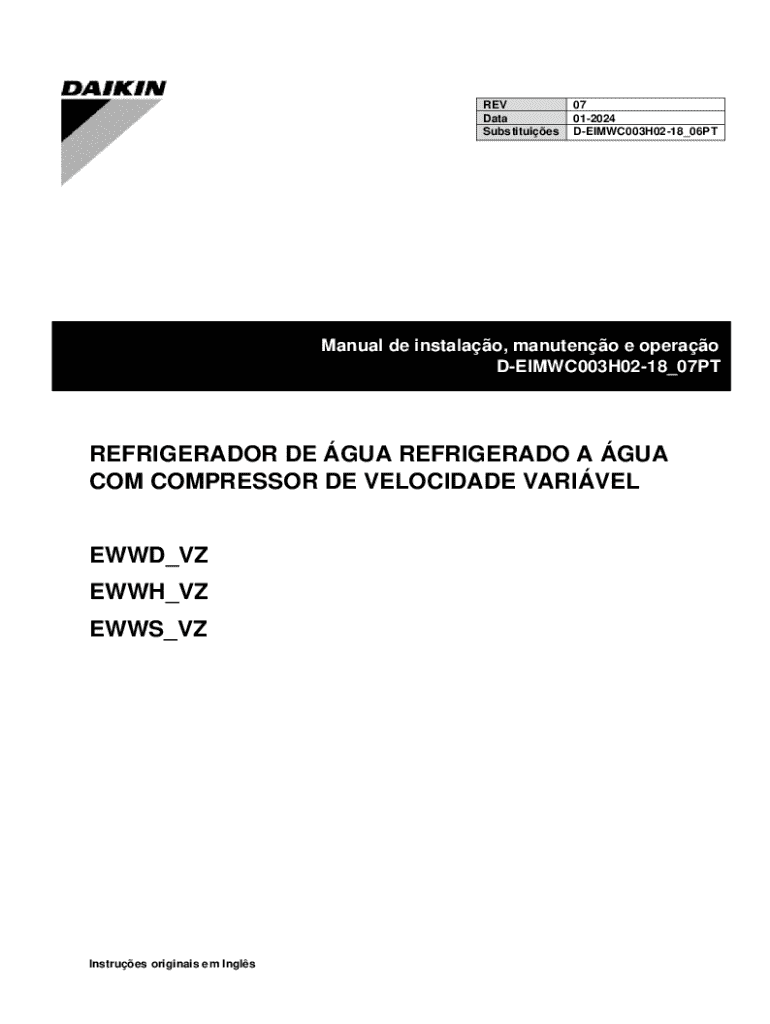 REV Data Substituies07 012024 DEIMWC003H0218_06PTManual de instalao, manuteno e operao DEIMWC003H0218_07PTREFRIGERADOR DE GUA REFRIGERADO A GUA COM COMPRESSOR DE VELOCIDADE VARIVEL EWWD_VZ EWWH_VZ