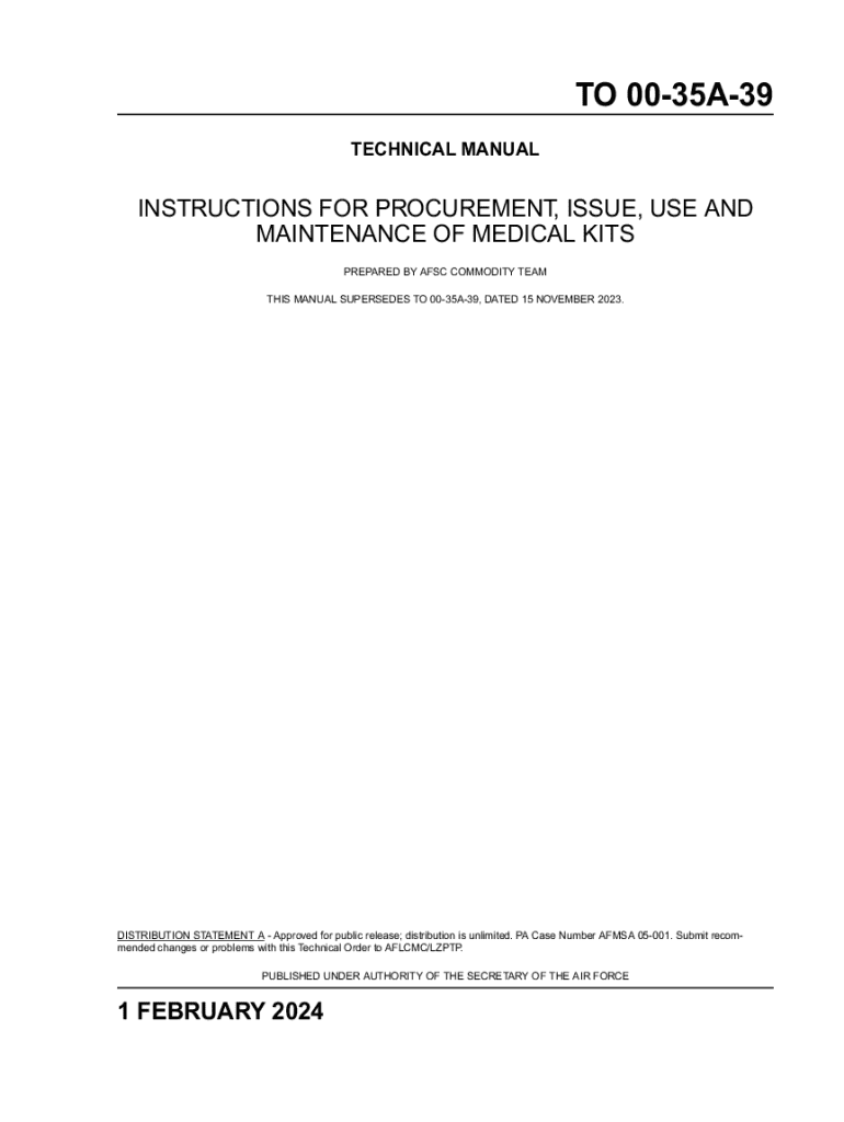 TO 0035A39 TECHNICAL MANUALINSTRUCTIONS FOR PROCUREMENT, ISSUE, USE AND MAINTENANCE OF MEDICAL KITS PREPARED BY AFSC COMMODITY TEAM THIS MANUAL SUPERSEDES TO 0035A39, DATED 15 NOVEMBER 2023.DISTRIBUTION