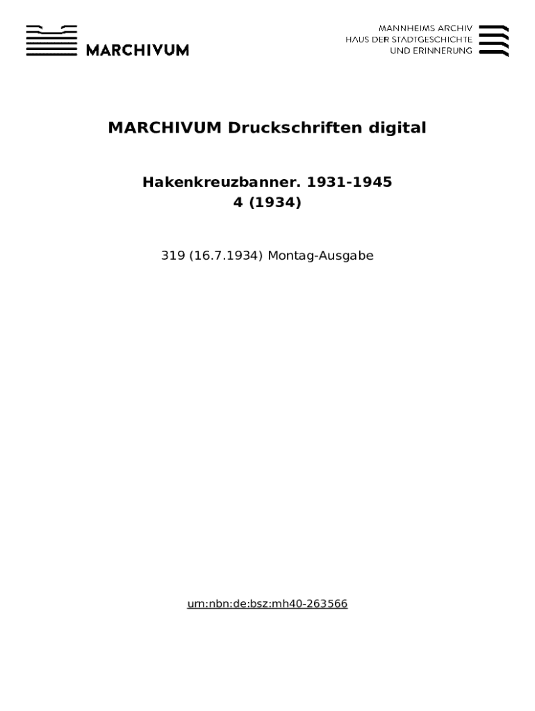 MARCHIVUM Druckschriften digitalHakenkreuzbanner. 19311945 4 (1934)319 (16.7.1934) MontagAusgabeurn:nbn:de:bsz:mh402635661Juli15 .AP .zbonnerI aufr,denAFEITTPreismorgensEngliche krnchterung gegenber