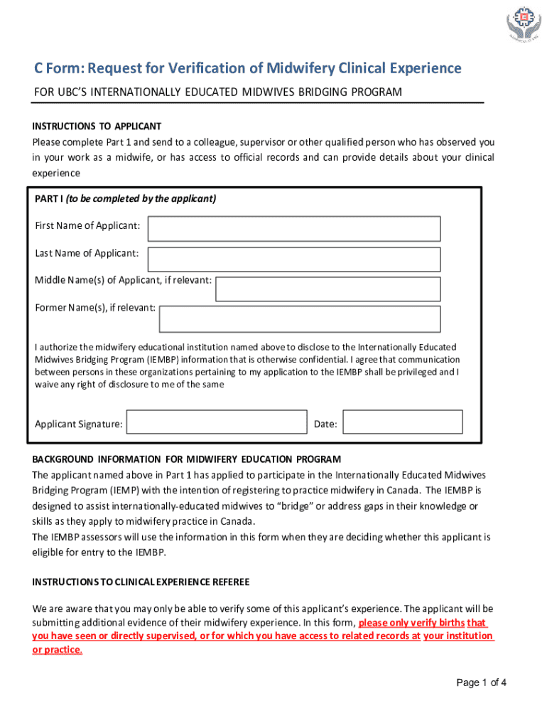 C Form: Request for Verification of Midwifery Clinical Experience FOR ABCs INTERNATIONALLY EDUCATED MIDWIVES BRIDGING PROGRAM INSTRUCTIONS TO APPLICANT Please complete Part 1 and send to a colleague,