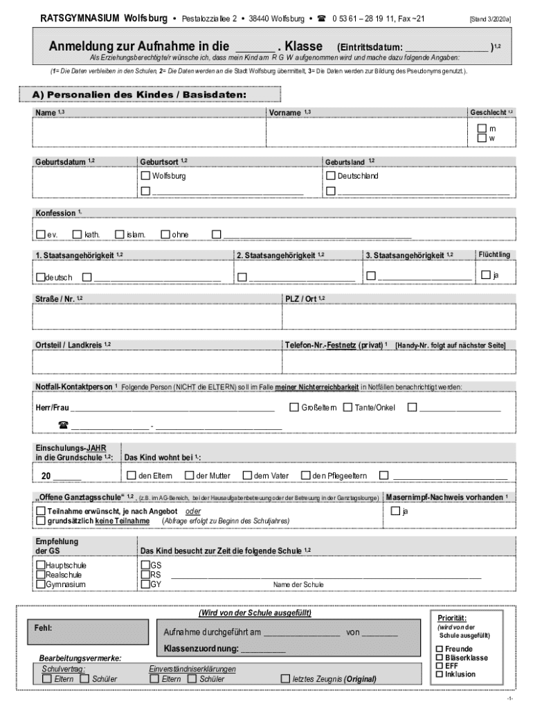 RATSGYMNASIUM Wolfsburg Pestalozziallee 2 38440 Wolfsburg 0 53 61 28 19 11, Fax 21Anmeldung zur Aufnahme in die ___ . Klasse[Stand 3/2020a](Eintrittsdatum: ___ )1,2Als Erziehungsberechtigte/r wnsche