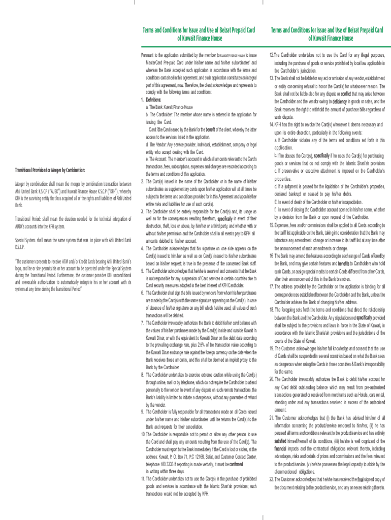 Transitional Provision for Merger by Combination: Merger by combination: shall mean the merger by combination transaction between Ali United Bank K.S.C.P (ABK) and Kuwait Finance House K.S.C.P (KFC),