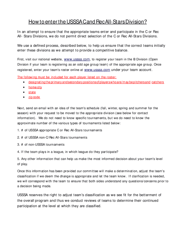 How to enter the USSSA C and Rec AllStars Division? In an attempt to ensure that the appropriate teams enter and participate in the C or Rec All Stars Divisions, we do not permit direct selection