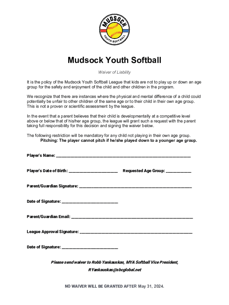 Mud sock Youth Softball Waiver of Liability It is the policy of the Mud sock Youth Softball League that kids are not to play up or down an age group for the safety and enjoyment of the child and other