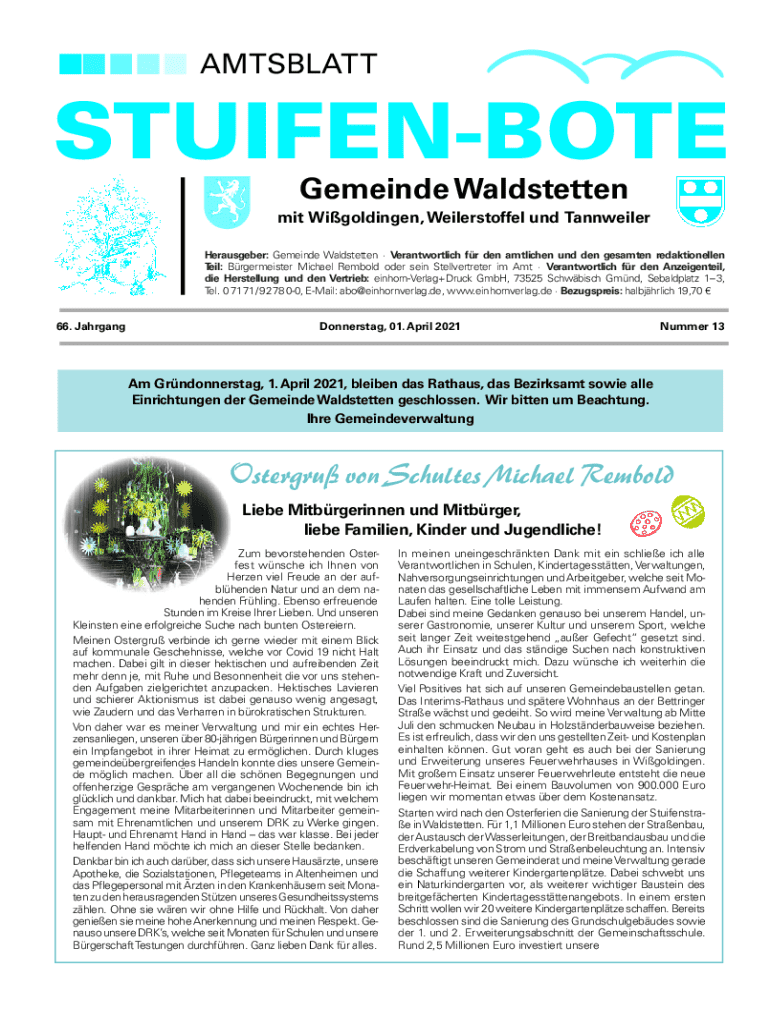 AMTSBLATTSTUIFENBOTE Gemeinde Waldstettenmit Wigoldingen, Weilerstoffel und Tannweiler Herausgeber: Gemeinde Waldstetten Verantwortlich fr den amtlichen und den gesamten redaktionellen Teil: Brgermeister