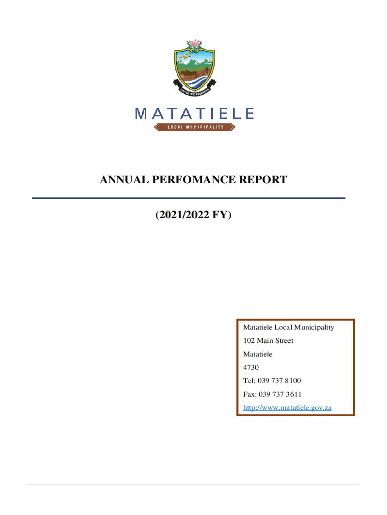 ANNUAL PERFOMANCE REPORT (2021/2022 FY)Matatiele Local Municipality 102 Main Street Matatiele 4730 Tel: 039 737 8100 Fax: 039 737 3611 http://www.matatiele.gov.zaAnnual Performance Report (APR) for