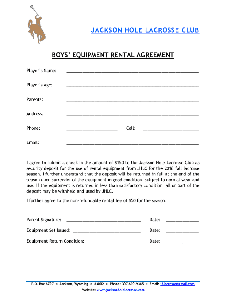 JACKSON HOLE LACROSSE CLUB BOYS EQUIPMENT RENTAL AGREEMENT Players Name:___Players Age:___Parents:___Address:___Phone:___Email:___Cell:___I agree to submit a check in the amount of $150 to the Jackson