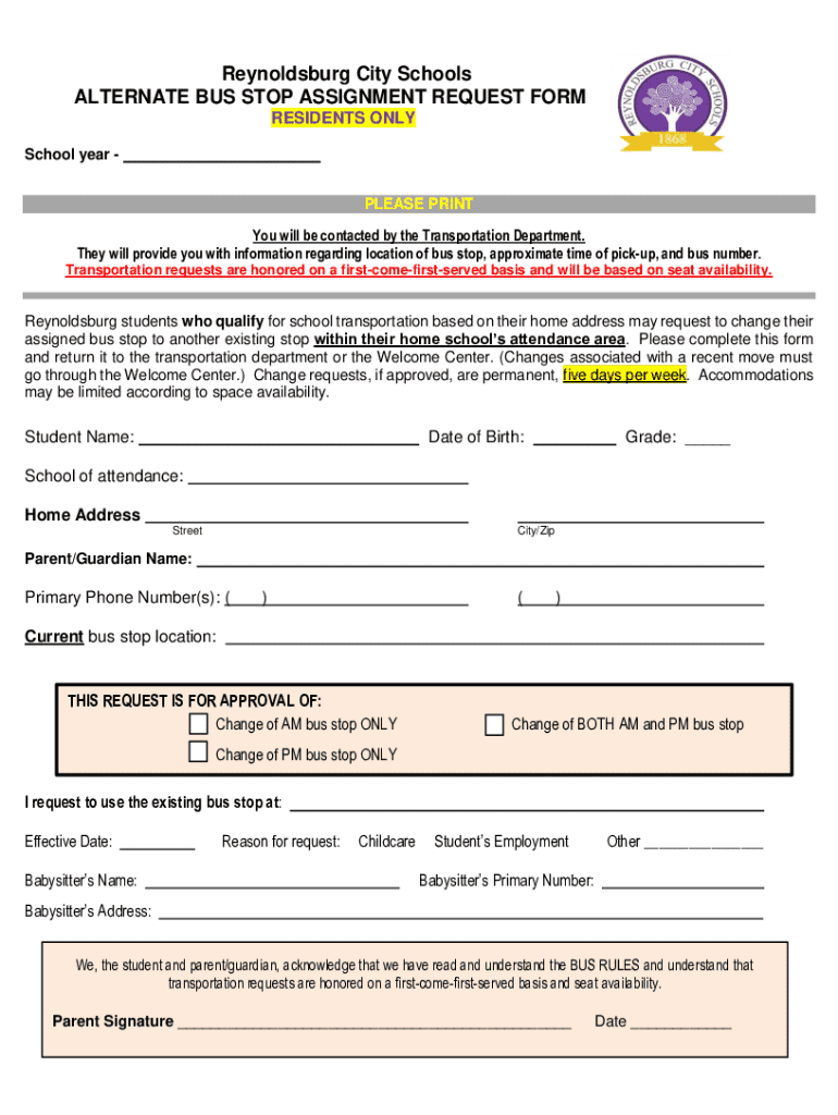 Reynoldsburg City Schools ALTERNATE BUS STOP ASSIGNMENT REQUEST FORM RESIDENTS ONLY School year PLEASE PRINT You will be contacted by the Transportation Department. They will provide you with information