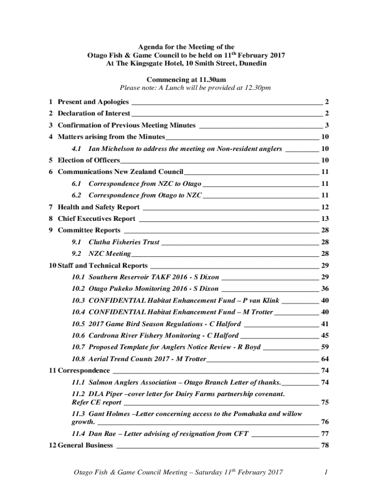 Agenda for the Meeting of the Otago Fish & Game Council to be held on 11th February 2017 At The Kingsgate Hotel, 10 Smith Street, Dunedin Commencing at 11.30am Please note: A Lunch will be provided