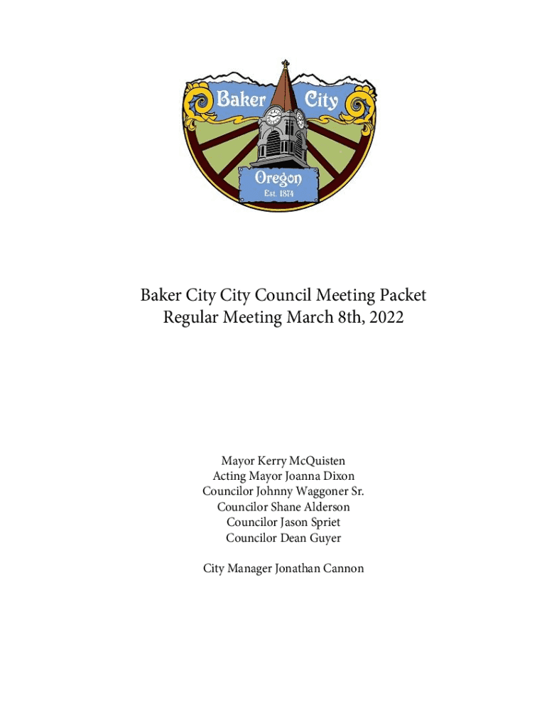 Baker City City Council Meeting Packet Regular Meeting March 8th, 2022Mayor Kerry McQuisten Acting Mayor Joanna Dixon Councilor Johnny Waggoner Sr. Councilor Shane Alderson Councilor Jason Spriet
