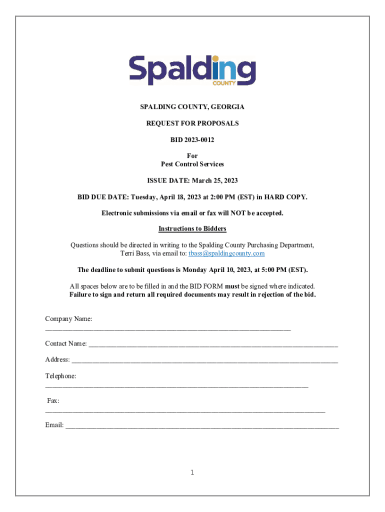 SPALDING COUNTY, GEORGIA REQUEST FOR PROPOSALS BID 20230012 For Pest Control Services ISSUE DATE: March 25, 2023 BID DUE DATE: Tuesday, April 18, 2023 at 2:00 PM (EST) in HARD COPY. Electronic submissions