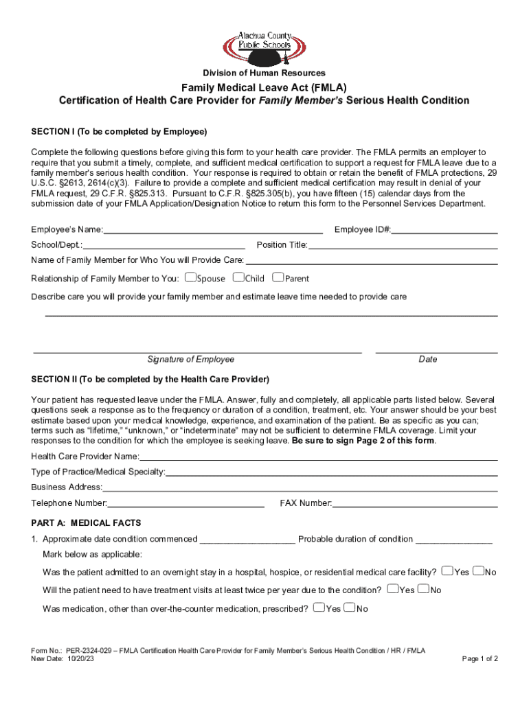 Division of Human ResourcesFamily Medical Leave Act (FMLA) Certification of Health Care Provider for Family Members Serious Health Condition SECTION I (To be completed by Employee) Complete the following