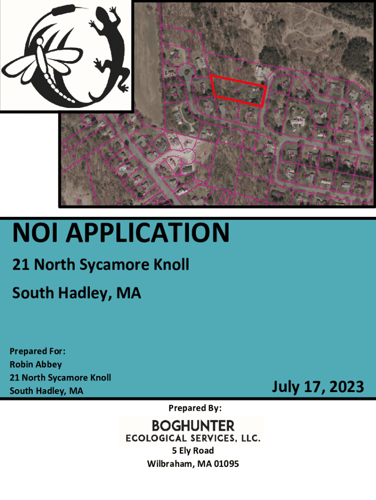 NOI APPLICATION 21 North Sycamore Knoll South Hadley, MA Prepared For: Robin Abbey 21 North Sycamore Knoll South Hadley, MAJuly 17, 2023 Prepared By:5 Ely Road Wilbraham, MA 010954 Provided by MassDEP:Massachusetts
