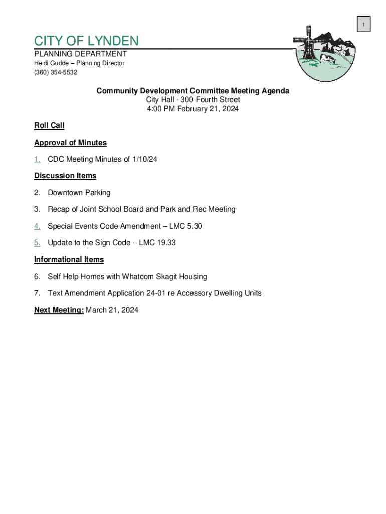 1CITY OF LYNDON PLANNING DEPARTMENT Heidi Guide Planning Director (360) 3545532Community Development Committee Meeting Agenda City Hall 300 Fourth Street 4:00 PM February 21, 2024, Roll Call Approval
