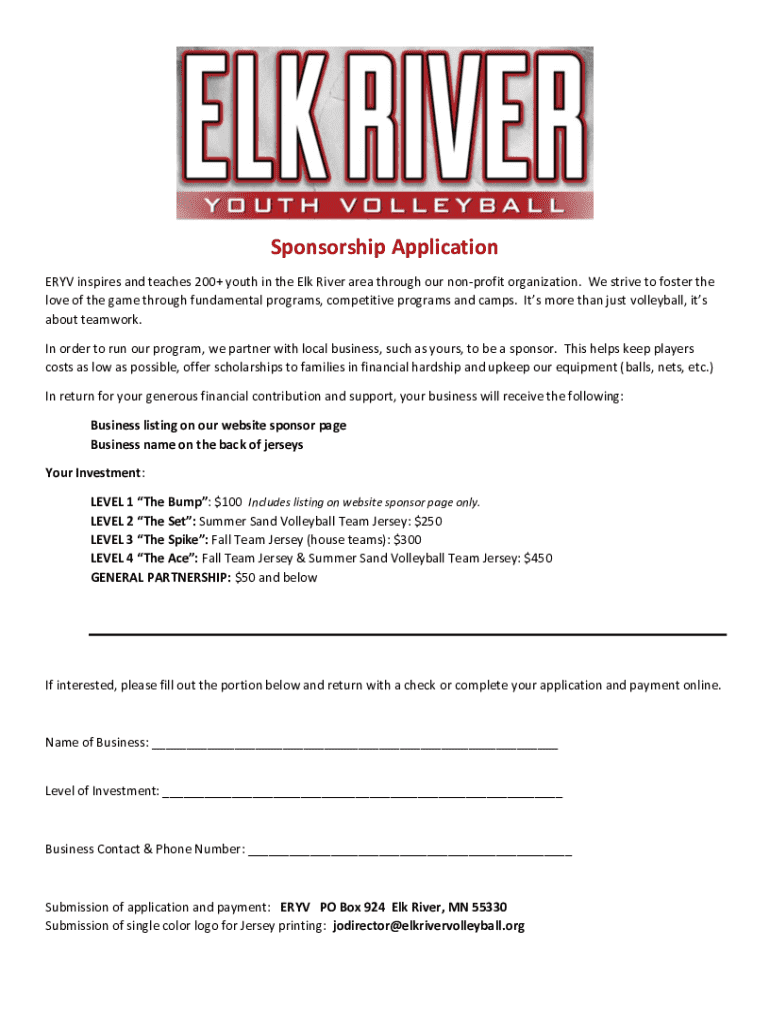 Sponsorship Application ERYV inspires and teaches 200+ youth in the Elk River area through our nonprofit organization. We strive to foster the love of the game through fundamental programs, competitive