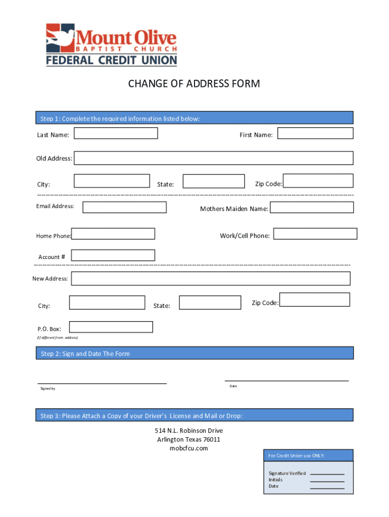 CHANGE OF ADDRESS FORM Step 1: Complete the required information listed below: First Name:Last Name: Old Address:Zip Code: City: State: Email Address:Mothers Maiden Name:Home Phone:Work/Cell Phone:Account