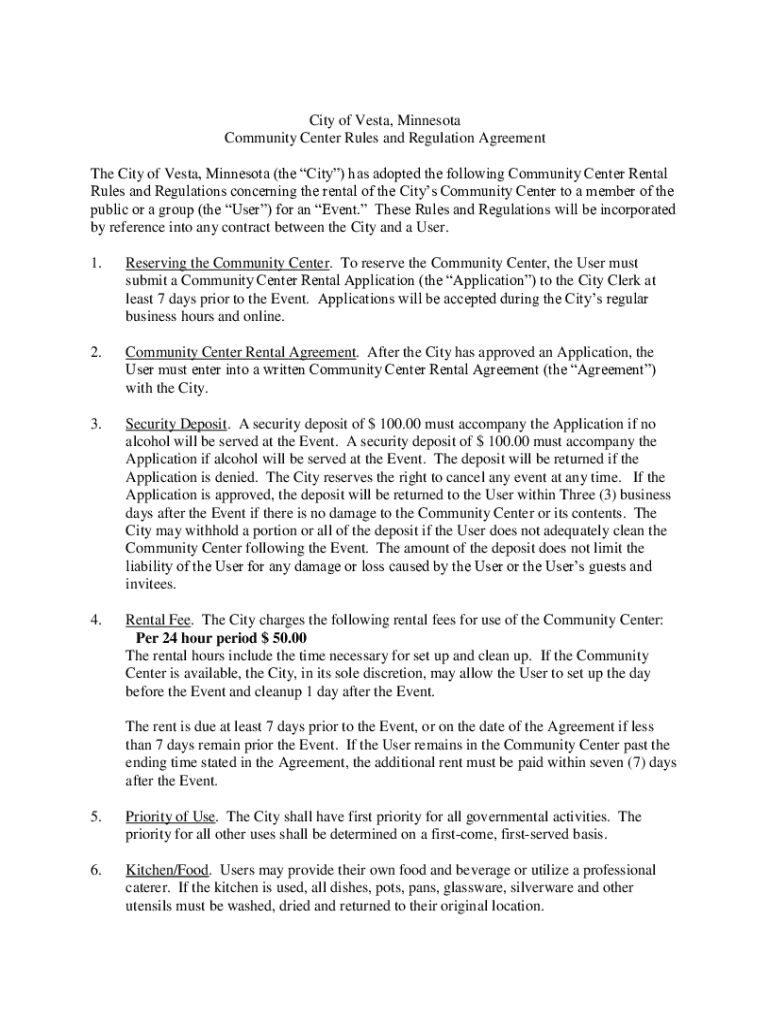 Get the free City of Vesta, Minnesota Community Center Rules and ...