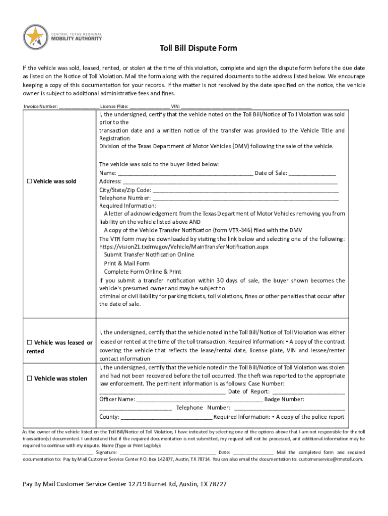 Toll Bill Dispute Form If the vehicle was sold, leased, rented, or stolen at the time of this violation, complete and sign the dispute form before the due date as listed on the Notice of Toll Violation.