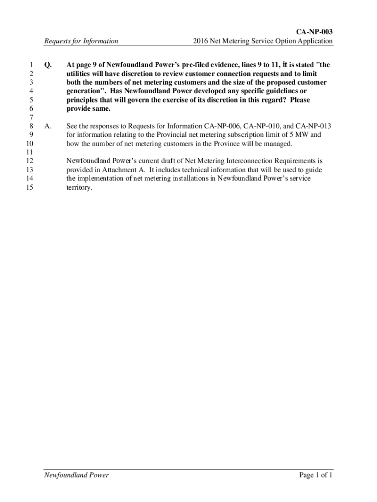 Requests for Information 1 2 3 4 5 6 7 8 9 10 11 12 13 14 15CANP003 2016 Net Metering Service Option Application. At page 9 of Newfoundland Powers prefixed evidence, lines 9 to 11, it is stated \”the
