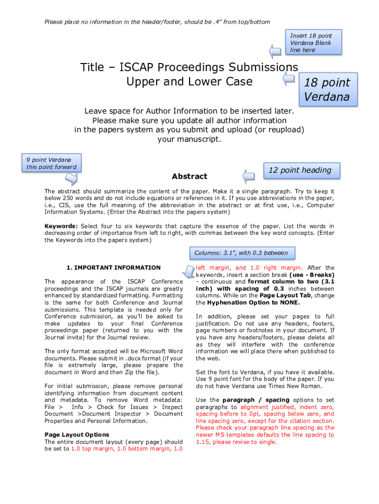 Please place no information in the header/footer, should be .4 from top/bottom Insert 18 point Verdana Blank line hereTitle ISCAP Proceedings Submissions Upper and Lower Case 18 point Verdana Leave
