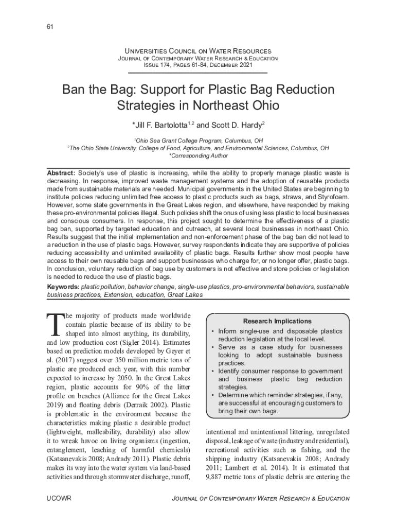 61Universities Council on Water ResourcesJournal of Contemporary Water Research & Education Issue 174, Pages 6184, December 2021Ban the Bag: Support for Plastic Bag Reduction Strategies in Northeast