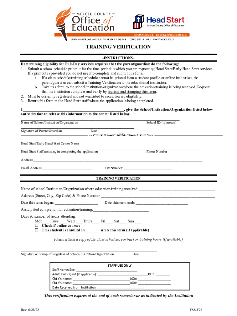 TRAINING VERIFICATION INSTRUCTIONSDetermining eligibility for Full Day services requires that the parent/guardian do the following: 1. Submit a school schedule printout for the time period in which