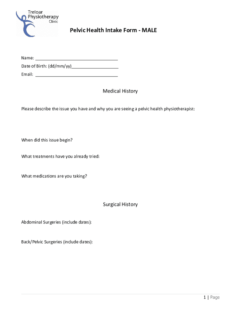 Individuals experiencing symptoms such as pelvic pain, urinary incontinence, or pelvic floor dysfunction may need to fill out a pelvic health intake form.