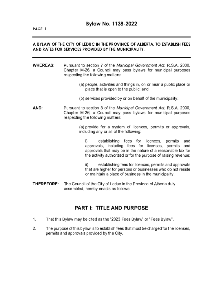 PAGE 1Bylaw No. 11382022A BYLAW OF THE CITY OF LEDUC IN THE PROVINCE OF ALBERTA, TO ESTABLISH FEES AND RATES FOR SERVICES PROVIDED BY THE MUNICIPALITY.WHEREAS:Pursuant to section 7 of the Municipal