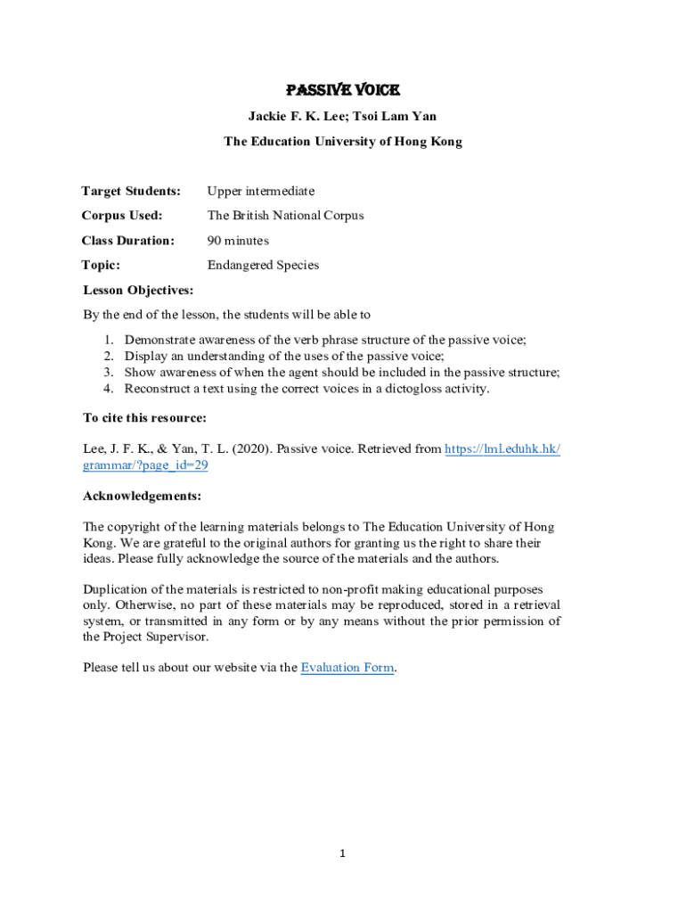 Passive Voice Jackie F. K. Lee; SOI Lam An The Education University of Hong Kong Target Students:Upper intermediateCorpus Used:The British National Corpuscles Duration:90 minutesTopic:Endangered SpeciesLesson